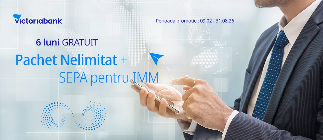 În perioada 9 februarie – 31 august 2026, clienții noi pot beneficia de Pachetul Nelimitat + SEPA pentru IMM, care include: